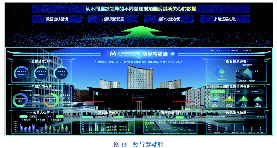 园区运营管理平台园区管理者通过领导驾驶舱对园区关键指标进行了解,为园区管理人员提供掌控园区整体运营情况的一体化信息呈现,领导驾驶舱支持钻取式查询,实现对整体性指标的逐层细化、深化分析。领导驾驶舱针对领导的不同关注点、不同管理层级进行数据定制,实现对指标内容灵活配置呈现(见图 16)。