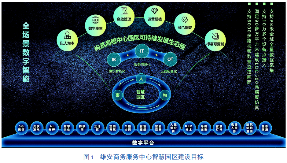 雄安商务服务中心智慧园区作为雄安新区数字城市的先行旗帜,依托全场景数字智能的理念,实现“IB+IT+OT”(建筑智能化+服务信息化+运营智慧化)的规建管用一体化新模式,以数字平台为支撑(支持PB级全域全量数据采集、支持10万多个设备点接入、满足90多万平方米建筑LOD500高精度仿真、视频数据支持6000多路监控画面),构筑商服中心园区可持续发展生态圈,围绕着以人为本、数字孪生、高效管理、运营增值、绿色低碳、标准可复制核心建设理念,实现对园区中人、事、物进行全方位的多场景化应用和极致体验(见图1)。