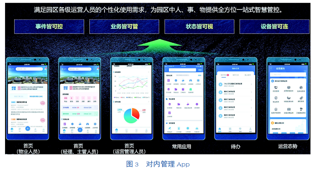 服务于园区各运营管理对象,对园区中人、事、物进行全方位一站式智慧管控,涵盖物业工单、巡检、安防、消防、通行、能源等多业务场景的应用全联接、数据全融合。可根据权限配置,设置满足各运营管理对象使用需求的个性化页面,为园区运营管理者提供方便快捷的移动办公工具,保障园区运转顺畅与高效(见图3)。