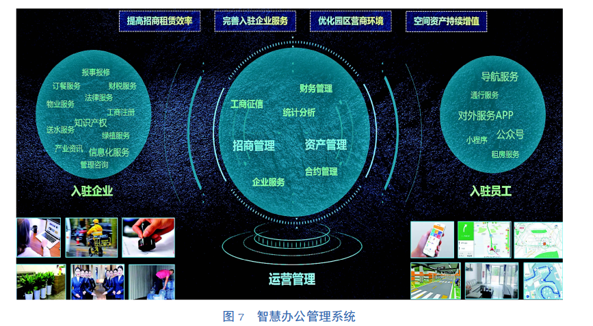 智慧办公管理系统提供以“园区运营”为中心的全方位、智慧化整体解决方案,通过智慧化软硬件结合,打造智慧园区运营管理、园企服务、综合服务三大体系,让园区运营管理智慧化、服务互联网化和移动化,全面提升产业园区的竞争力,同时也为入驻企业和入驻员工提供更加方便、高效的服务(见图7)。