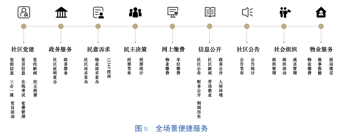 智慧党建、政务服务、网格信息管理、高空抛物、智慧安防、智慧消防、智慧电梯、电动车监控。