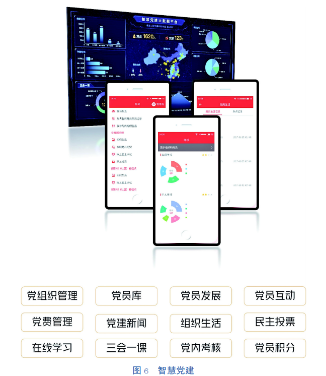 以移动互联网为载体,遵循党章党规,结合党建实际工作,运用“互联网+”理论,打造集党务管理、党员服务与精神文明建设于一体的创新型智慧党建平台,助力党建工作可持续发展(见图6)。