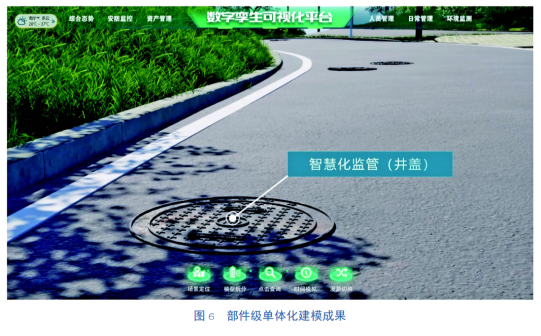 数字孪生智慧园区平台充分将基础地理信息数据、新型基础测绘、实景还原技术、3D可视化与3D建模技术相结合,着力打造虚实融合的场景化全要素管控园区,为园区提供周边较大范围内的基础地理信息底板数据。通过无人机快速获取园区周边范围内的实景三维模型,通过3D建模技术完成园区室外超写实精细化三维模型,包括路灯、井盖、消防栓、地下管道等部件级设施设备的单体化建模,如图2所示。