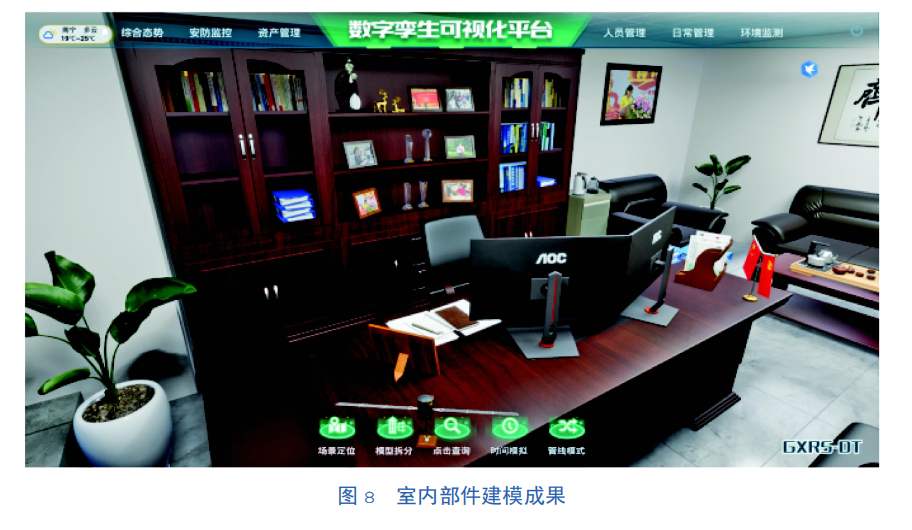 通过数字孪生技术,实现对园区及其周围环境的真实模拟,以提供更直观的信息展示和分析工具,构建室内外一体化场景、地上下一体化场景、动静态一体化场景等全息三维空间。路灯、井盖、消防栓、地下管道、室内部件等设施设备均为部件级单体化建模成果,如图6~图8所示。