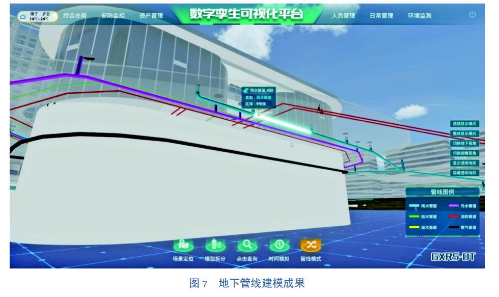 2)管线管理。通过智能化的地下管线系统,可实现地上、地下一体化、管线数据的综合管理,结合地理信息系统(GIS)技术、数据库技术和三维技术,直观显示地下管线的空间层次和位置,以仿真方式形象展现地下管线的埋深、材质、形状、走向以及工井结构和周边环境,满足各种对管线数据管理维护的需要。