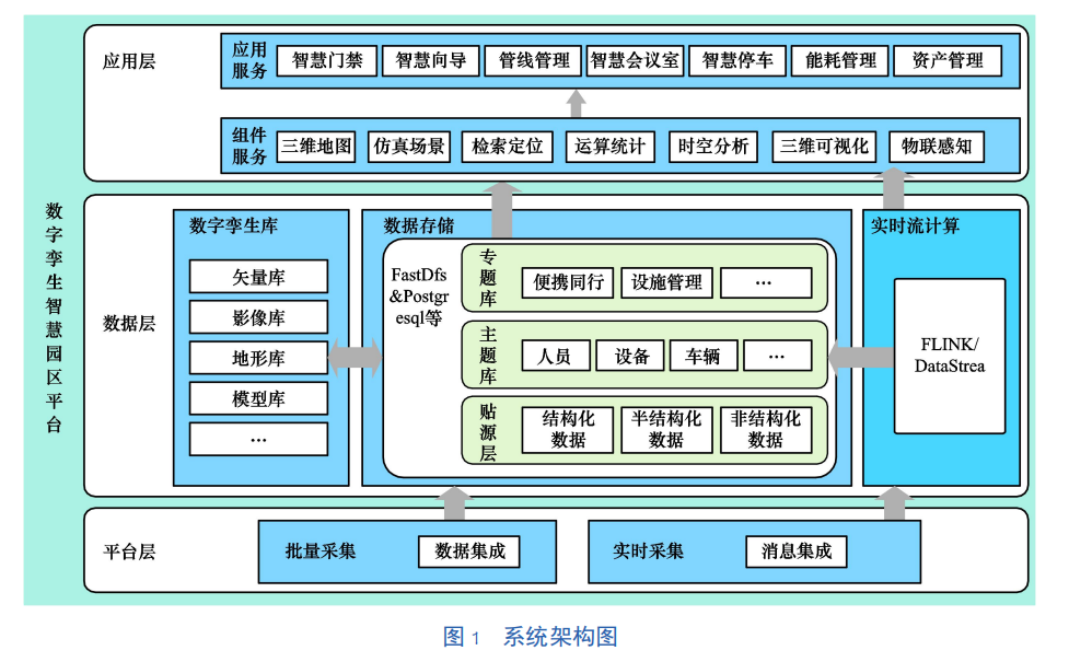 数字孪生智慧园区平台总体架构由数据层、系统平台层、应用层三个部分组成,如图1所示。总体框架设计采用C/S架构,层级之间功能解耦,增加了系统的可拓展性。