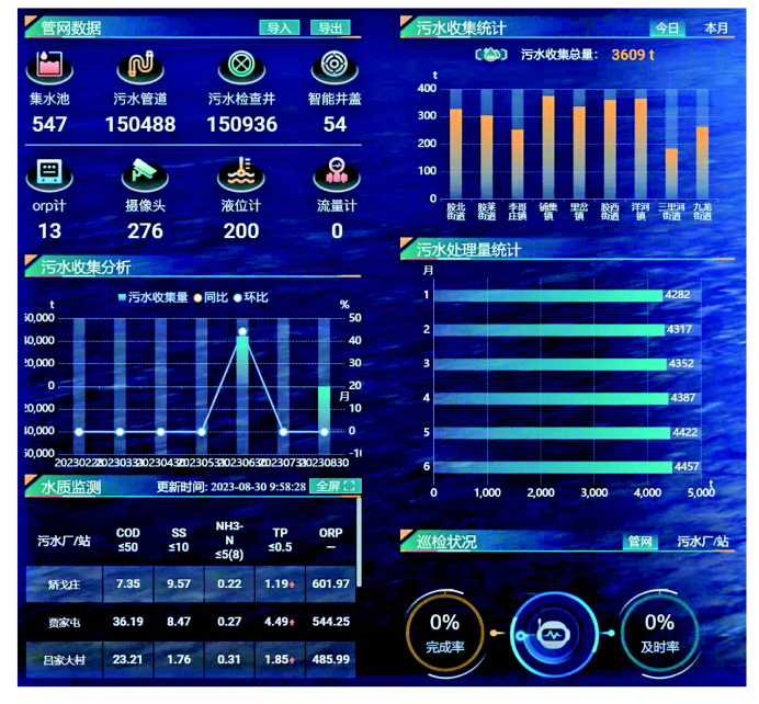宏观布局:综合概览模块展示胶州市全市维度、镇/街道维度、村维度、污水厂的污水收集、处理的统计分析数据(见图1),同时在BIM模型中可直观地看到胶州市污水厂分布。