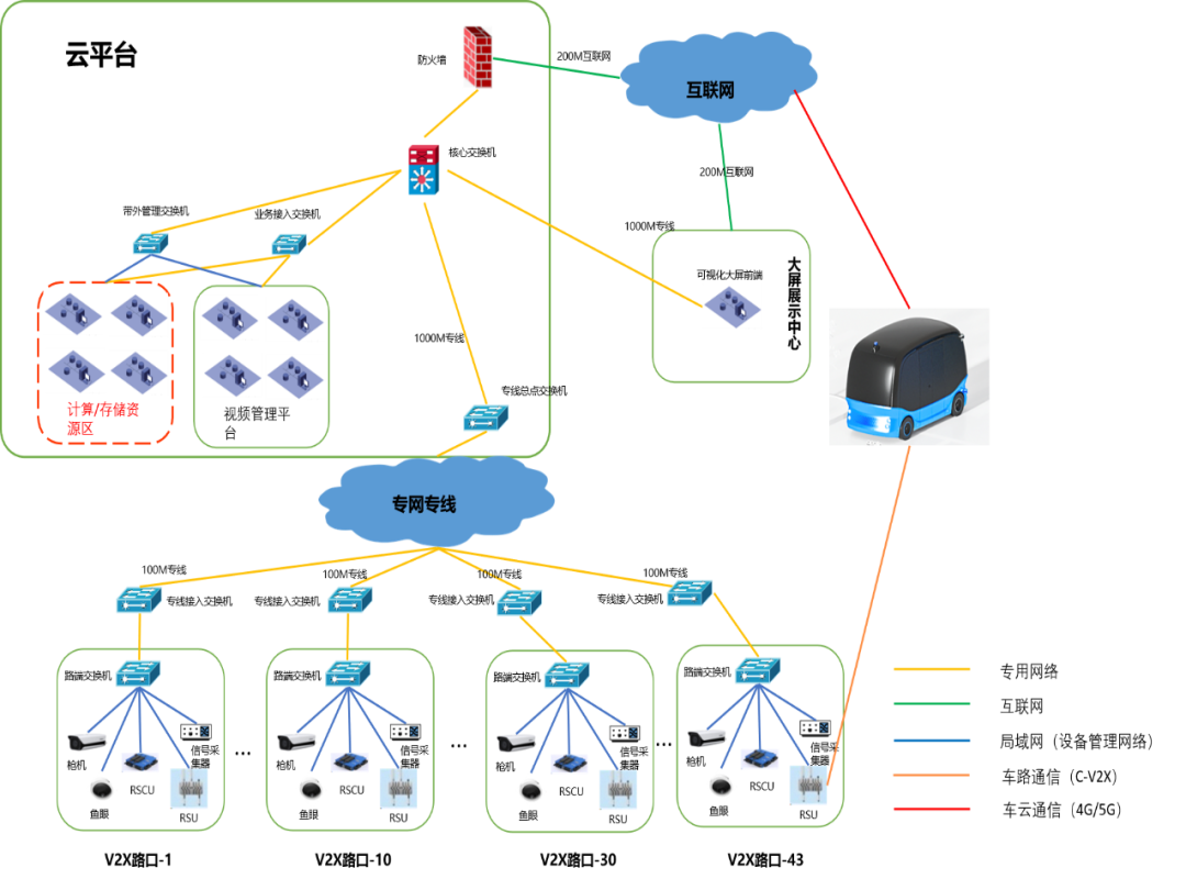 2.云平台数据中心(主要承载路侧边缘计算设备数据接入、可视化大屏系统以及云控平台系统的日常运营使用)与路口通过专网提供数据传输,满足100M(上下行各100M)的带宽与低于200ms的延时要求。