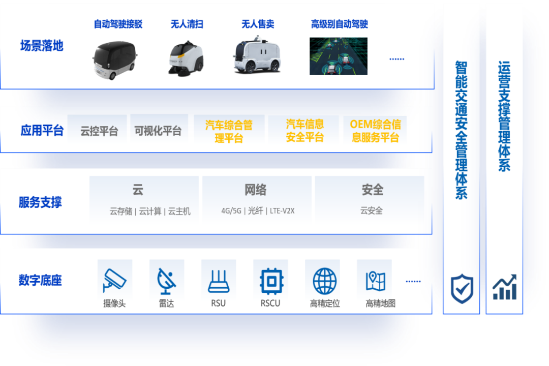 包括云、网络、安全等为智能驾驶系统提供运行能力的IT信息支撑。为智能网联系统提供高效、稳定、安全的运行的环境。