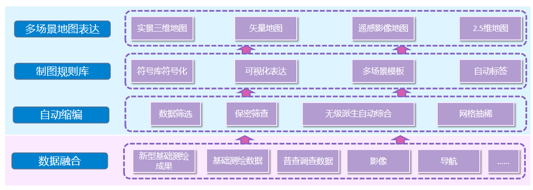 北京市智慧城市“一图”“一码”共性基础数据建设通过数据融合、产品拓展、一体化制图等关键技术,结合新型基础测绘北京试点成果,将基础地理数据、普查调查数据、导航、影像等多源数据融合和二三维产品拓展,研发多个软件工具,形成多源异构的智慧城市一张图数据库,并且通过可视化、负载均衡、一体化制图软件自研,形成包含矢量地图、影像地图、三维地图等北京2000城市坐标系统一基准的通用地图成果,数据成果建设如图3所示。