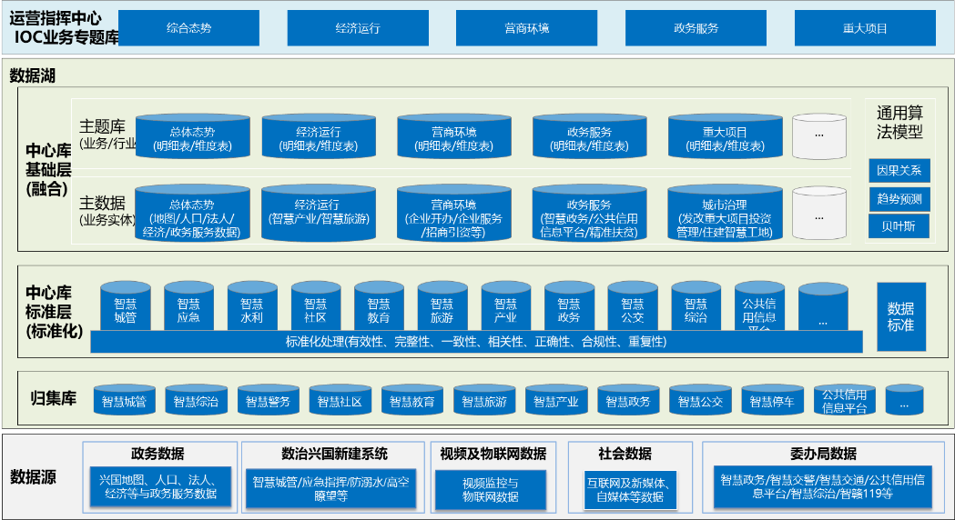 政务数据、社会数据等通过大数据平台的数据汇聚系统统一归集到大数据中心形成原始数据层;原始数据资源通过数据治理平台对数据的清洗加工,进入中心库,再进一步对数据进行清洗、比对、标准化,形成规范可用的基础库、主题库、专题,并以共享平台为载体,提供数据共享服务,将数据开放给政府决策支持中心或各类大数据应用,进一步发挥大数据的价值。