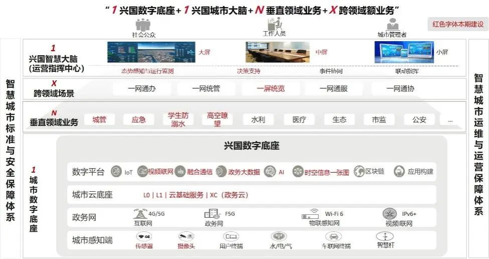 “数治兴国”总体架构就是“1城市数字底座+1兴国智慧大脑+N垂直领域业务应用+X跨领域业务应用”,简称“数治兴国1+1+N+X”: