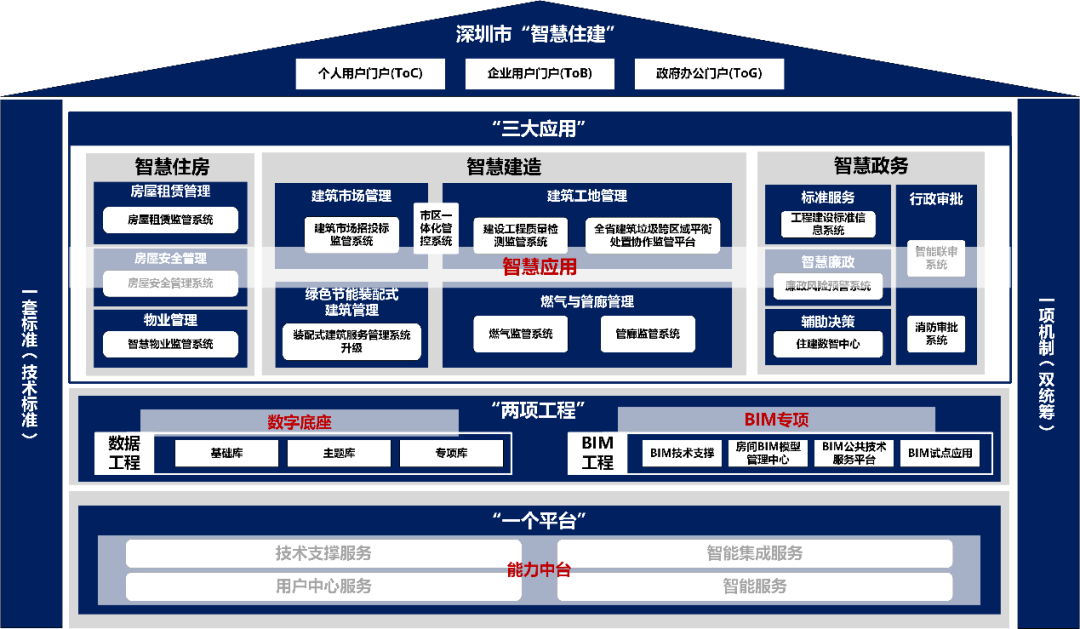 回顾深圳市住建信息化建设工作,在数据资源方面,市局各部门以自身业务为导向,建成了一批行业数据库,通过探索BIM技术在新建项目报建和重要建筑翻模应用,积攒了大量BIM成果,在系统应用方面,构建包含工程项目监管、住房管理、行业管理等10类共72个应用系统,支持全局各项日常业务开展。在此过程中数据资源分散、各业务系统割裂、未形成全局联动的信息化体系等问题也逐渐显现。为此,在技术引领和政策驱动下,结合深圳实际问题,市住建局于2022年正式启动“智慧住建”项目,将前沿信息技术与住建领域业务深度融合,持续推进住建的数字化转型,力争在基础底座、数据工程、BIM应用、决策支持等方面取得突破性进展,全面提升深圳住建信息化能力和公共服务水平。