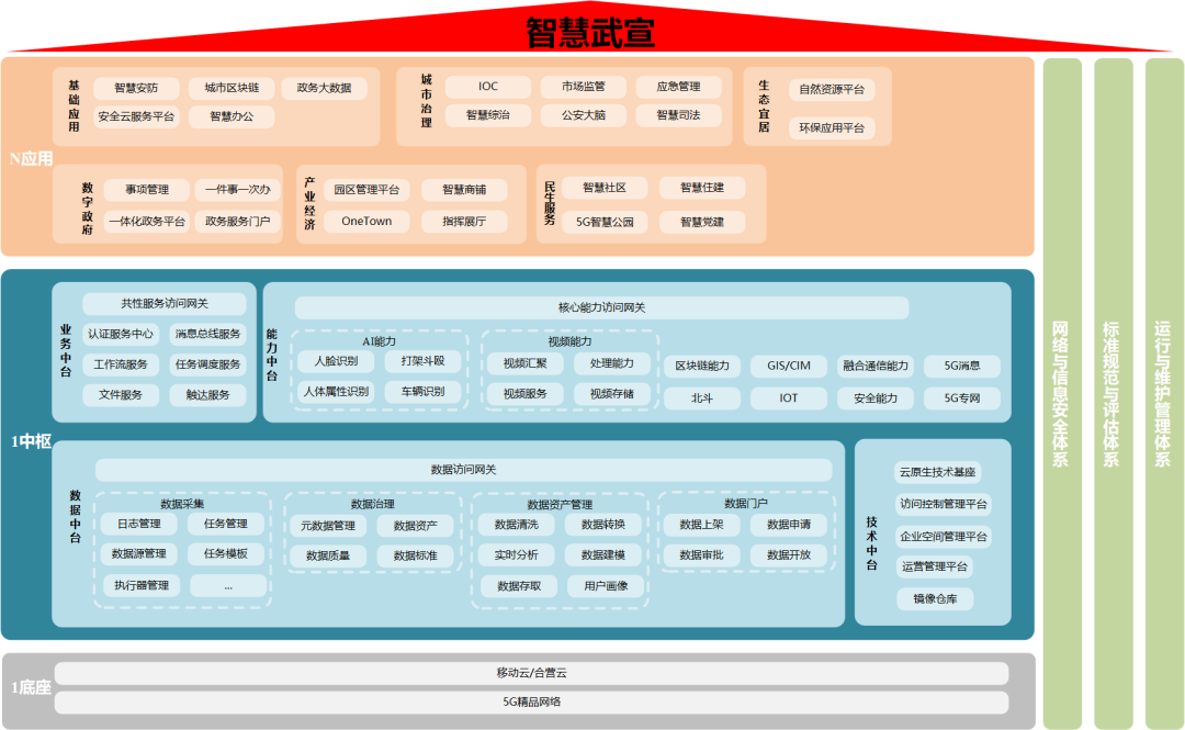 智慧武宣整体架构:打造“一底座、一中枢、三体系、N应用”的“1+1+3+N”整体架构,提升城市治理能力、促进生产力跨越发展。智能中枢作为智慧城市能力平台,包含四大核心中台,实现平台打通,数据汇聚,业务互联,承载城市运营中心(IOC)和多个行业应用,赋能一点细节全知情,一图业务全囊括。
