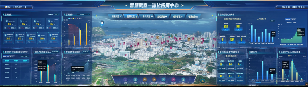 武宣县智慧武宣一体化指挥中心基于数据中台、视频云平台、视频AI、数字孪生等能力平台,全面整合武宣经济、交通、应急、城市管理等领域的城市运行数据,通过数据关联融合形成城市运行关键体征指标体系,通过建设智慧武宣,平安武宣,出行武宣,城市管理以及智慧应急五个主题全面呈现城市运行的综合态势,为武宣县经济社会高质量发展安上智慧“大脑”。