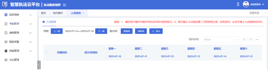 执法勤务管理依托移动执法终端、执法记录仪、便携式车载动态取证系统等完善的执法装备,实现人车物事泛在感知,为日常执法监督工作的开展实现实时化、精细化的管理。通过智能排班、智能考勤、脱岗预警、巡查抽查等方式,实现对每一个执法人员、每一辆执法车辆、每一个执法案件、每一个执法过程的实时动态监督,以监督促考核,助力法治政府阳光执法体系的建设。