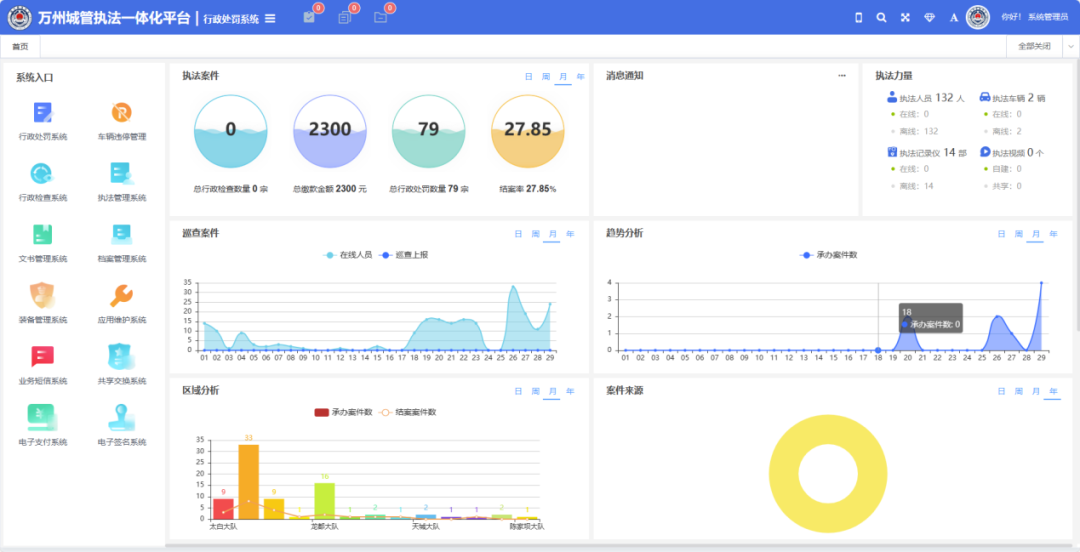 基于万州区智慧城管综合执法系统,对行政执法主体、执法人员、执法案件、权责清单、法律法规等以时间、空间、数量等维度进行聚类分析、研判,为部门三定方案修订、权责清单修订等提供科学数据依据,结合大数据为热点敏感问题进行信息收集、部门人员量化考核、依法行政考核等提供实时动态数据支撑;通过拓展智慧化功能,实现案件智能分析、智能调查取证、预警自动推送、案件自动匹配、裁量标准推荐、疑似案件推送、信息自动填充、文书自动生成、语言智能录入、路径自动规划、案件智能督查、执法智能学习,通过智慧化手段赋能,为执法业务办理提质增效。