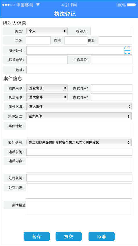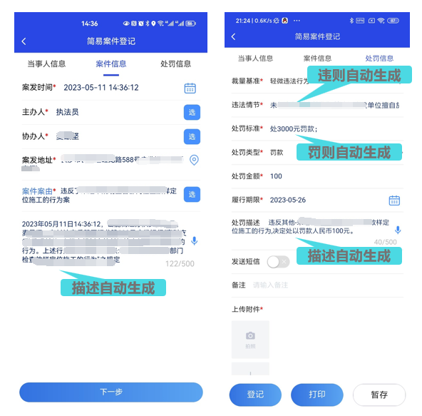 执法案件管理体系依托移动端+PC端的“两端”应用模式,实现执法办案、执法案件全流程在线办理,通过标准化、常态化的工作模式,能够有效、及时发现并应对执法过程中出现的文书制作不规范、处罚结果不公平、法律适用不准确等问题,提升执法办案水平,提升执法办案质量,提升执法部门对外形象。执法文书管理如图3所示,移动执法如图4所示。