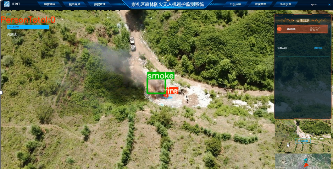 无人机搭载高清变焦摄像头、红外热成像仪对山区、林地等森林防火关注区域进行大范围机动式航飞巡查过程中,实时获取目标区域的高清图像和地表温度分布信息,结合基于图像视觉的烟火识别算法与基于红外热成像的火点识别算法,对地面火情线索进行自动识别,快速发现潜在火灾风险。该算法适用于森林防火巡视、火灾高发季节保障等情况,相较于传统人工地面巡查极大提高了巡查效率,保障生命财产和森林资源安全。