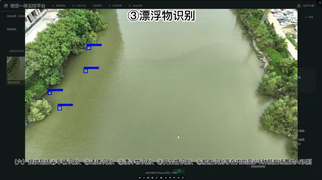 基于无人机获取的海岸、河道等区域的图像数据,通过水面漂浮物算法自动识别分析水体表面污染情况。一旦发现存在漂浮垃圾、浮游植物等现象,无人机会发出警告并拍摄留存,并进行定位。算法适用于海岸巡查、水环境巡检等场景,可以帮助相关部门进行精准快速定位,强化监督发现机制,守护水环境生态发展,为河湖海长效管理工作的精细化、智能化提供有力支撑。