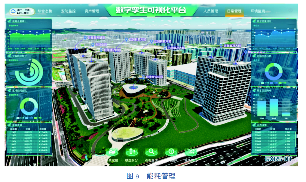 1)能耗管理。通过智能化的能源管理系统,对接后台数据实时更新,可以监测和控制用电、用水等各种能源的消耗,并生成数据报表,实现能耗智能化分析管理,全面提升能源的利用效率和管理水平,为节能优化改造提供可靠依据,降低园区的能耗,实现智慧园区能源一站式管理。