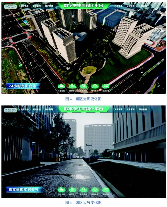 同时园区场景预置了24小时光影变化、阴晴雨雪霾天气变化等环境数据模型,通过拖动时间控制轴,可模拟真实世界的天气、时间、光影变化,并支持结合空气颗粒物密度、云量、雨量等参数,用户自主微调节场景天气呈现效果,可实现天气、时间、光影仿真模拟的效果同步反馈至植被等周围素材展示效果。同时也可通过与天气系统对接,实现环境模拟内容根据实际天气数据进行自动切换,如图4、图5所示。