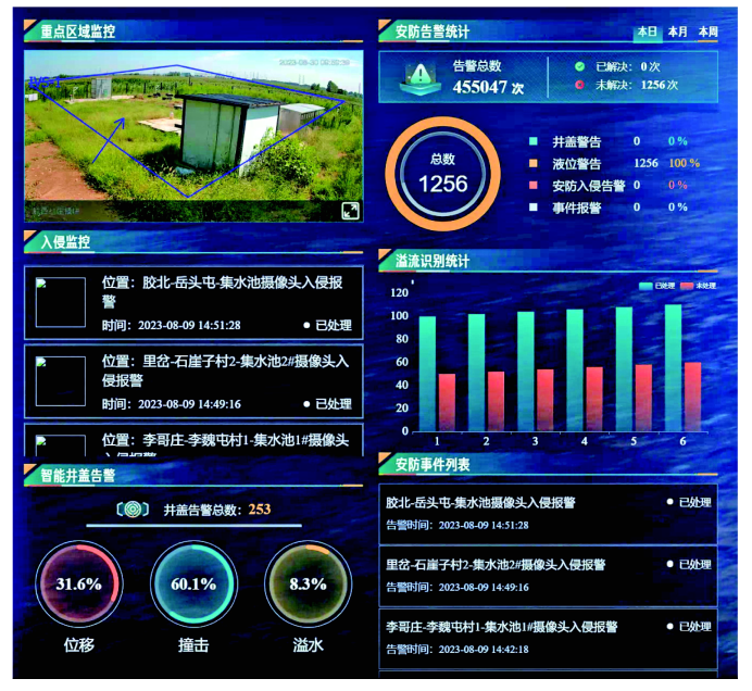 安防态势可实现对重点区域进行监控,查看监控视频轮播,实时掌握重点区域的安防态势;可实现异常告警,对抓拍入侵、溢流识别、井盖告警进行统计分析;可配置巡检事件,展示巡检计划完成情况,并在BIM模型中展示巡检轨迹,查看巡检结果;可在三维模型中展示井盖、摄像头等设备的位置信息,并能查看具体设备的详细信息及摄像头的实时画面信息。