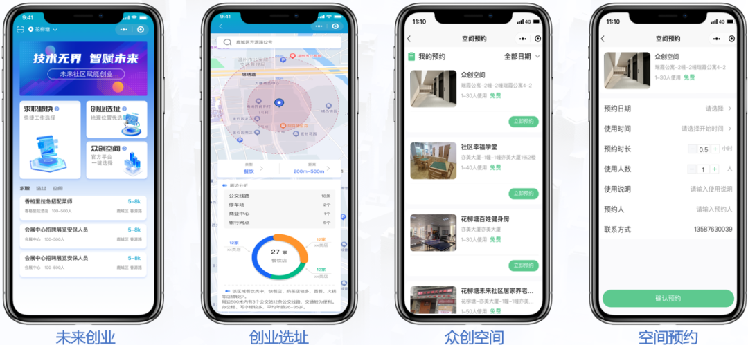 9)未来创业场景建设:主要包括亲清政策、创享工位等场景为居民提供创业政策解读、提供更好的创业和工作环境,从而实现社区与居民共同发展。