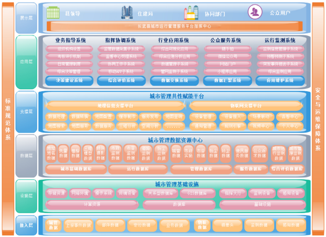 长武县城市运行管理服务平台(一期)是以计算机硬件与网络通信平台为依托、以标准规范体系为依据、以信息安全体系为保障、以应用系统建设为目标的大型信息系统。系统是以网络基础设施平台、基础软硬件平台、相关标准和信息安全为依托,以城市信息化管理应用为核心。系统总体架构分为六层,包括接入层、设施层、数据层、平台层、应用层和展示层,系统总体架构如下图: