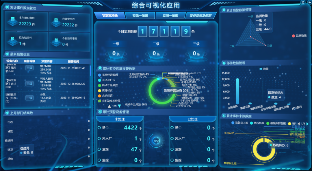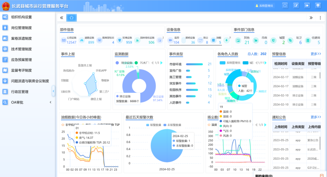 综合展示城市的事件、环卫、人防等运行情况,显示区域整体运行态势,了解城市整体运行情况,辅助城市运行决策。