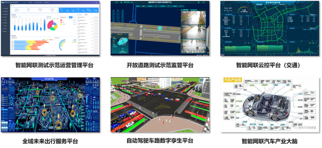 包括智能网联云控平台、智能网联可视化平台、智能网联汽车综合管理平台、智能网联汽车信息安全平台,对整个区域内的交通状况进行实时分析研判,发现区域交通运行中的各种问题、事件以及趋势,同时把智能网联大数据分析的结果实时发送到车端,与车端实现信息交互。