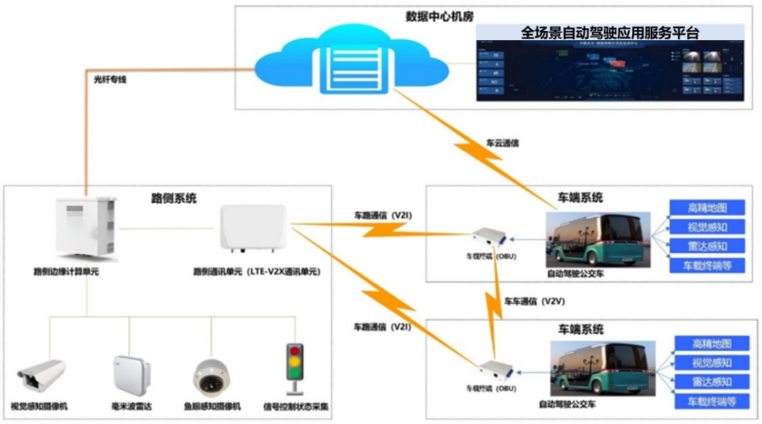 在本项目智能网联系统当中,智能网联基础设施终端开展数据采集,通过路侧边缘计算节点上部署的感知引擎,对感知终端所采集到的数据以AI算法开展数据处理,从而可以获得道路上运行的车辆、人员、事件以及交通流感知和分析结果,以光纤网络将这些结果传输到全自动驾驶应用服务平台。