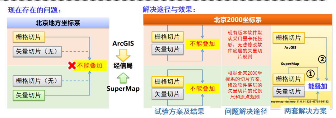 针对北京大数据中心平台发布的基于北京2000坐标系的栅格切片和矢量切片电子地图不能叠加,无法满足经信局和各委办局的业务需求的问题,本案例提出了基于定制SuperMap软件的两套电子地图叠加方案,重置底层切片规则,重新定义比例尺和原点,为BJ2000坐标系在全市应用奠定基础。