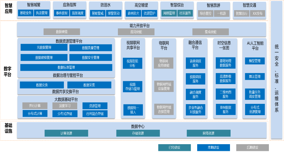 数字平台是新一代城市信息化技术平台,涵盖人工智能、大数据、视频云、数字孪生等创新技术,平台具体包含:大数据平台、视频云平台、融合通信平台、时空信息服务平台、人工智能平台。