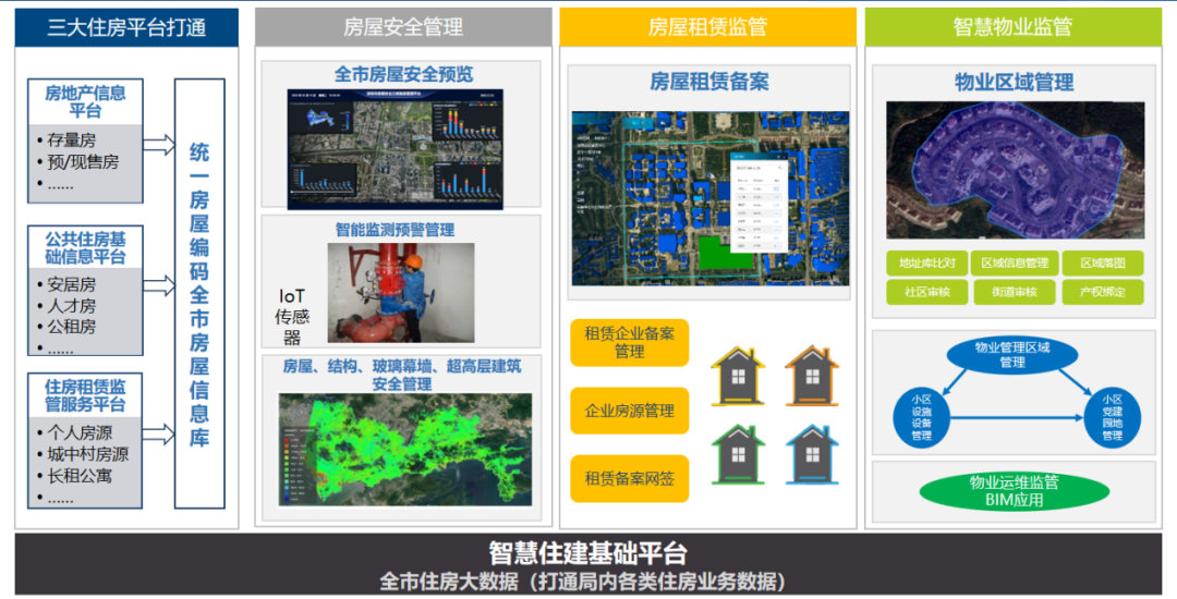 智慧住房是在整合利用现有公共住房、租赁系统等现有平台基础上,升级完善租赁系统的功能;基于统一房屋编码,通过危房治理、幕墙排查、安全隐患排查等方面业务流程,建立一套实用性强、业务覆盖面广的房屋安全管理系统;通过各类物业监管与服务事项信息化,实现物业管理相关信息管理的公开和开放,提供便利,为提升物业小区生活质量和居民满意度,消除安全质量隐患,营造共建共治共享的社会治理格局。智慧住房包含房屋安全管理系统、房屋租赁管理系统和智慧物业监管系统。