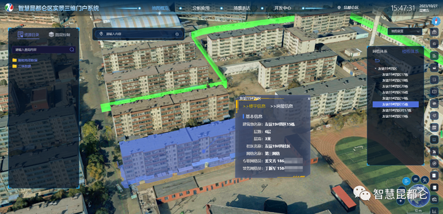 构建昆区分层分户模型。通过对分层分户三维模型的构建,将各幢、层、户进行三维模型展示,解决无法直观表达二维空间上的分布情况的问题。通过定制开发分层分户数据采集系统,调度900余个网格员,接入全区15个街道,1002个网格近1万栋建筑。通过三维立体房屋模型,基层工作者能更方便更精准开展网格精细化服务,提高基层治理现代化水平。