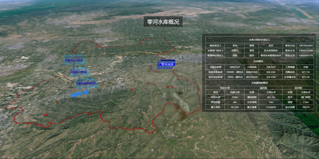 水库概况界面为零河水库雨水情测报监测平台的第一个子系统,主要展示了水库管理权属信息及宏观地理位置,右侧表格显示相关安全责任人及水库建筑物概况。