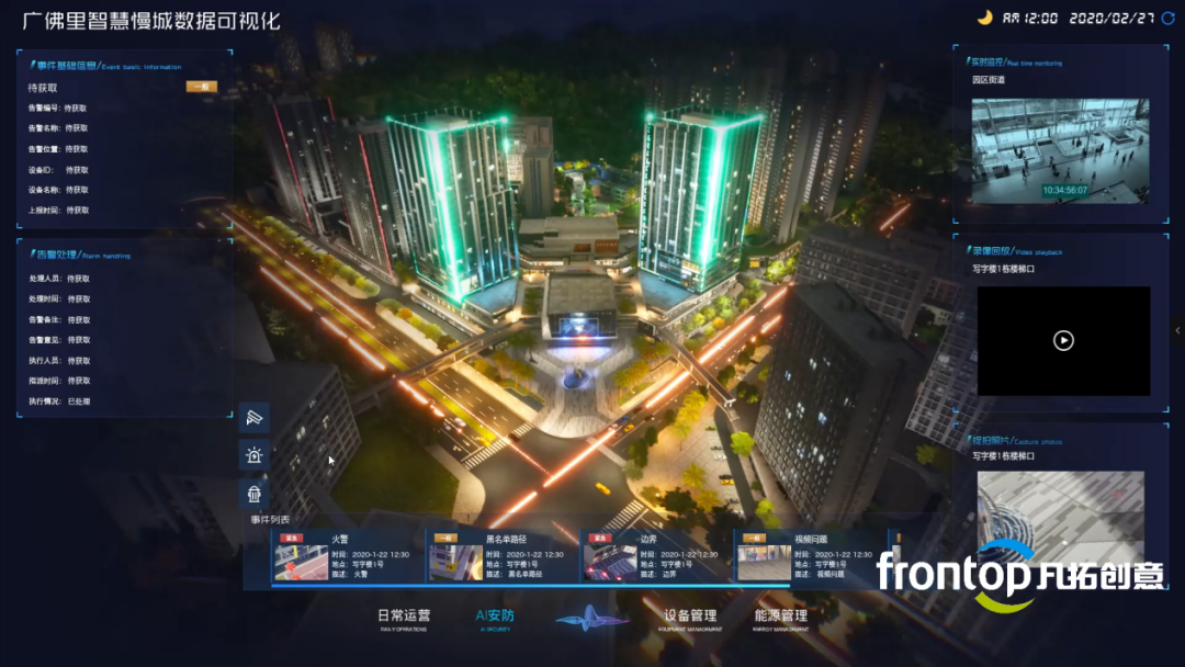 数据可视层是直接呈现给客户的应用,包括智慧园区IOC大屏态势感知仪表盘和专题决策分析。其中应用前端支持: